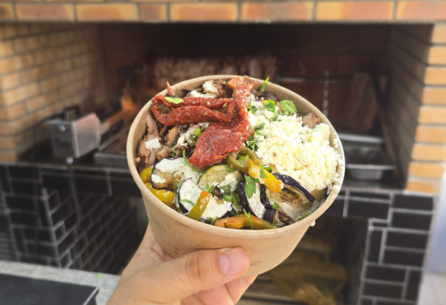 Dans un bol généreux, nos lamelles de kebab fumé partagent la scène avec les mêmes légumes grillés, des jeunes pousses croquantes, quelques graines de grenade pour la touche acidulée et une pluie de feta crémeuse. Arrosé d’un filet de sauce yaourt-menthe ou tahini-citron — à vous de choisir — ce bowl concentre toute l’âme du Berliner sans le pain, pour une pause haute en couleur et en saveurs.