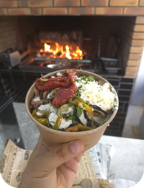 Kebab au feu de bois, légumes grillés, tomates confites, feta et persil sur lit de salade, le tout nappé de sauce artisanale.